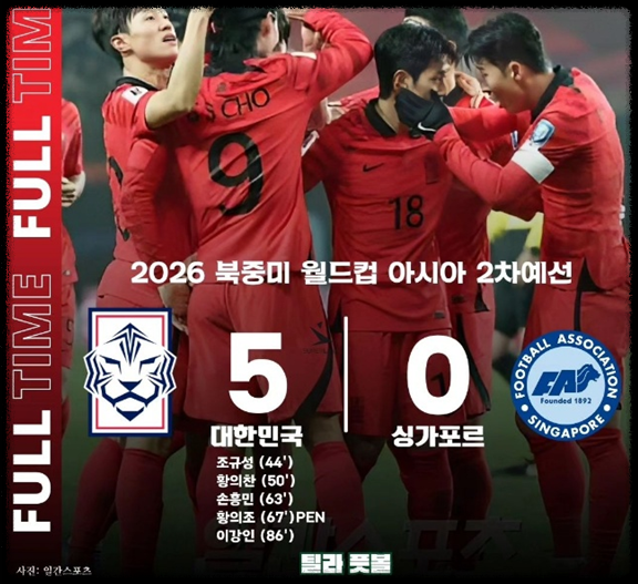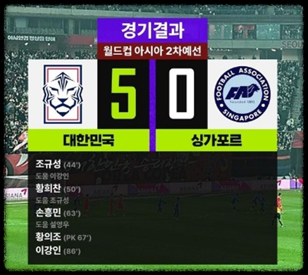 1. 한국 vs 싱가포르 결과 : 5 대 0 승리