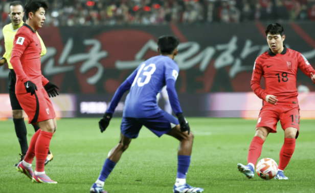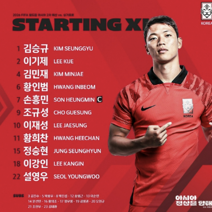 📌 4-1-4-1 포메이션으로 조규성이 최전방에 위치했고 측면에 황희찬과 이강인이 섰습니다. 중원에는 손흥민과 이재성이 배치됐으며 수비진은 이기제, 김민재, 정승현, 설영우가 구축했고 수비라인 앞에 황인범이 자리를 잡았습니다.