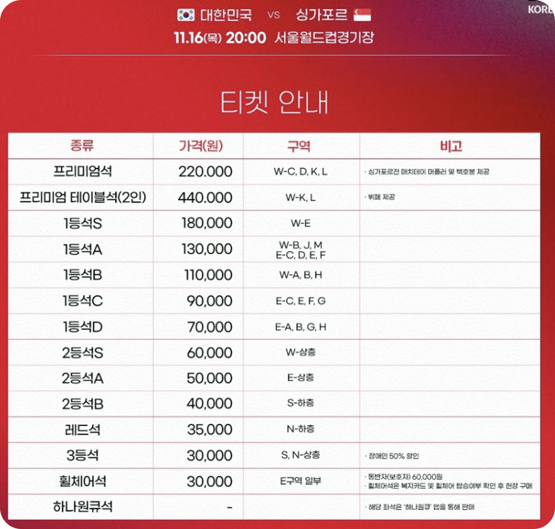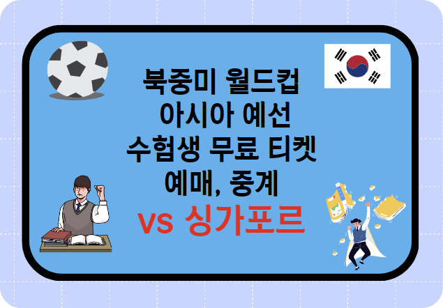 2026년 북중미월드컵 아시아지역 2차 예선 경기 1차전, 한국 VS 싱가폴이 11월 16일 펼쳐질 예정입니다. 또한 수능을 보는 수험생들을 위한 응원 이벤트로 무료 티켓 증정 이벤트가 진행됩니다. 이 기회를 놓치지 말고 경기장에서 손흥민, 이강인 등 선수들의 플레이를 보며 스트레스를 풀어야 겠죠? 그럼 지금부터 1차전 경기에 대해서 무료 티켓예매하는 방법, 실시간 중계보기, 하이라이트 보는 법에 대해서 전부 알아보도록 하겠습니다.