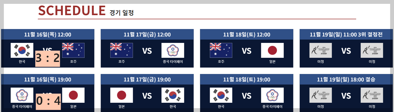 📌팀당(한국, 호주, 일본, 대만) 총 4경기씩을 치루며 예선리그 각 3경기, 순위결정전 1경기를 진행