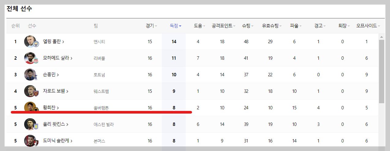 황희찬은 현재 리그경기에서 16경기를 뛰며 8골로 득점 순위 5위를 기록하고 있습니다. 공동 5위이긴 하지만 지난 시즌에 비하면 엄청난 속도로 골을 성공시키고 있으며 조만간 10골 달성은 무난할 것으로 보입니다.