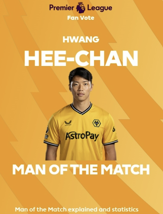 경기 후 팬 투표로 진행된 EPL 홈페이지 경기 MVP에는 황희찬이 결승골 및 2골을 넣은 윌리안을 제치고 선정돼 그 활약상을 인정받았습니다. 유럽 축구 통계 매체 후스코어드닷컴은 황희찬에게 양 팀 통틀어 최고 평점인 7.5점을 매겼습니다.