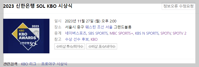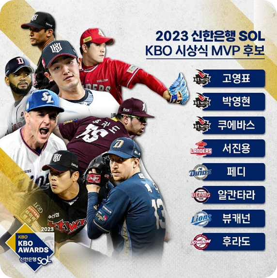 올 시즌 프로야구 최우수선수(MVP)와 신인왕이 27일 가려집니다. 한국야구위원회(KBO)는 오는 27일 오후 2시 서울 웨스틴조선호텔 그랜드볼룸에서 2023 신한은행 SOL KBO 시상식을 개최합니다. MVP와 신인왕은 한국야구기자회 소속 언론사와 각 지역 언론사 취재기자들의 사전 온라인 투표로 정해지는데요, 미리 후보를 확인해보고 과연 누가 최우수선수와 신인왕이 될 지 예측해보도록 합시다.