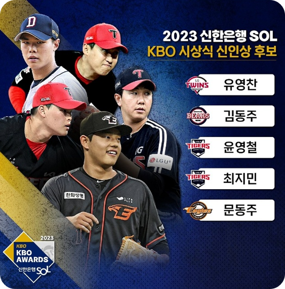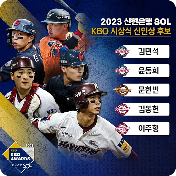 📌신인상 레이스에서는 문동주(한화 이글스), 김민석(롯데 자이언츠), 윤영철, 최지민(이상 KIA 타이거즈), 유영찬(LG 트윈스) 등 10명이 경쟁을 벌이게 됩니다. 신인왕은 지난 5년 내로 입단한 동시에 누적 기록이 투수는 30이닝, 타자는 60타석을 넘지 않아야 받을 수 있습니다.