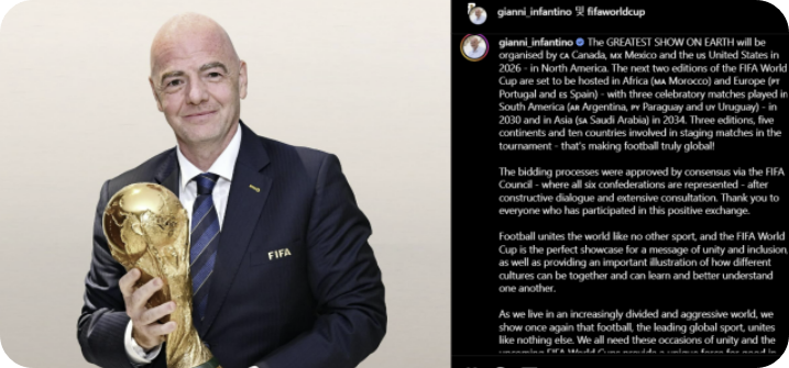 그리고 인판티노 회장은 2034년 월드컵 개최지도 거론하고 나섰습니다. 인판티노 회장은 2034년 월드컵은 사우디아라비아에서 열린다고 공언했습니다. 이어 "3개 대회(2026·2030·2034년 월드컵)가 5개 대륙, 10개국에서 벌어진다"며 "축구를 진정으로 글로벌하게 만들고 있다"고 강조했습니다.