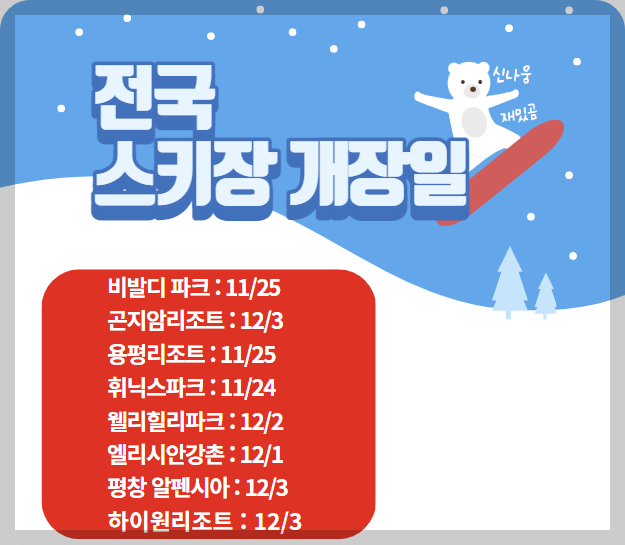 ✅ 11월 말인 24일을 시작으로 스키장이 하나씩 개장을 시작합니다. 자세한 일정은 아래에 있으니 방문하길 원하는 스키장을 확인하면 되겠습니다.