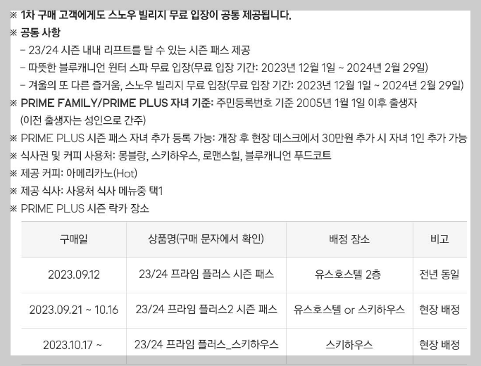 시즌패스에 차별화 포인트를 많이 추가한 휘닉스파크입니다. 프라임 플러스 자녀 1+1 혜택에 전용주차장, 시즌 락카까지 포함되어 있으며 겨울 메가 엑티비티 시즌 내 무료로 제공이 됩니다. 그리고 휘닉스파크는 다른 곳보다는 가장 빨리 오픈을 하며 가장 늦게 폐장을 하는 곳입니다. 18개 전체 슬로프도 오픈되니 실력별로 나뉜 쾌적한 슬로프를 이용할 수 있습니다.