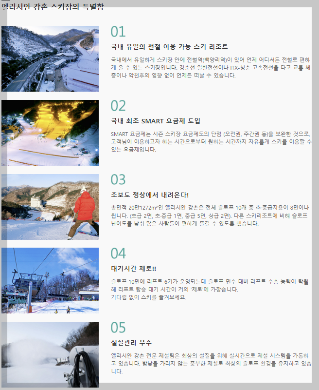 다른 곳과 차별화된 특별한 이유가 있는 엘리시안 강촌입니다. 우선 접근성이 한 시간 거리로 좋기 때문에 많은 분들이 좋아하고 지하철로 갈 수 있는 국내 유일의 스키장 리조트입니다. 또한 복합문화공간을 이루고 있고 다양한 부대시설과 서비스를 제공하기 때문에 거의 모든 고객들의 만족을 실현시키는 곳입니다.