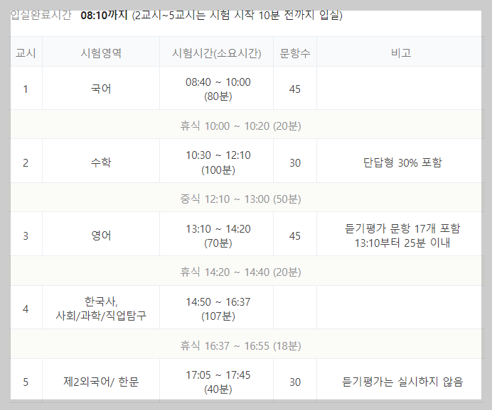 교시마다 쉬는 시간이 20분 있지만 항상 5~10분 전에 미리 입실하여 마음의 준비를 하며 감독관의 지시에 따라 시험을 진행해야 하니 주위하시기 바랍니다.