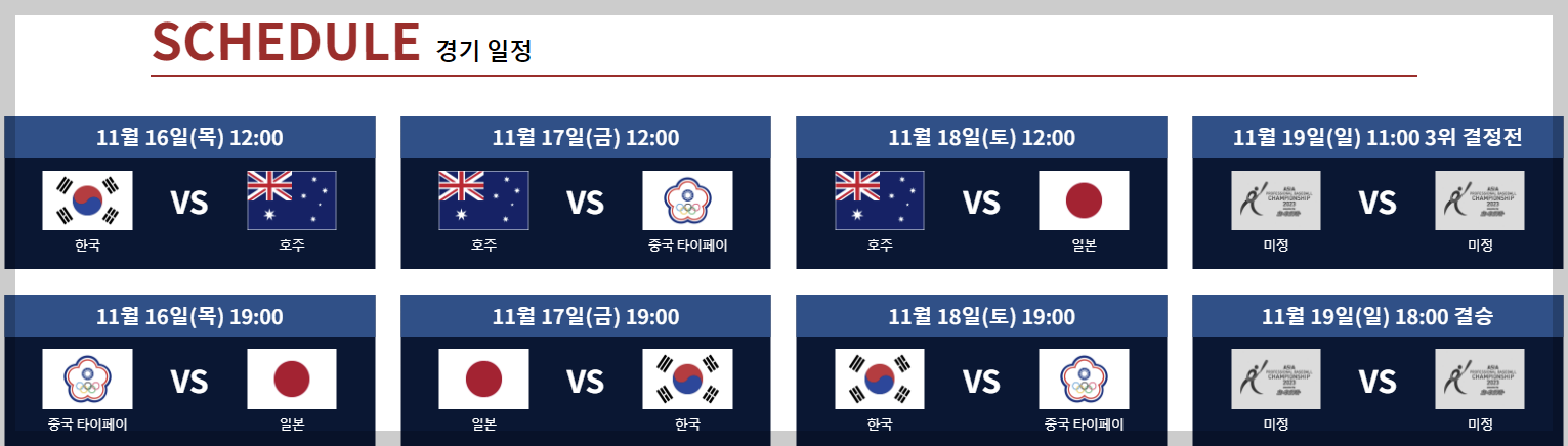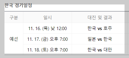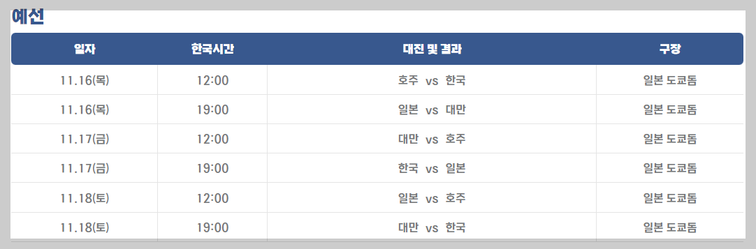 📌 대한민국은 호주-일본-대만 순으로 경기를 치릅니다. 호주와의 경기는 낮 경기이지만 그 다음 일본과 대만, 그리고 3위결정전, 결승이 오후 6시, 7시 경기이기 때문에 친구나 지인과 모여 시청하기 참 좋습니다.