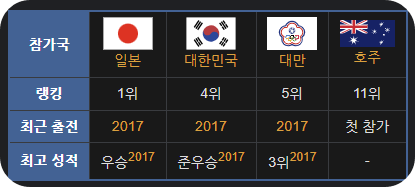 📌 대한민국(4위), 일본(1위), 대만(5위), 호주(11위)