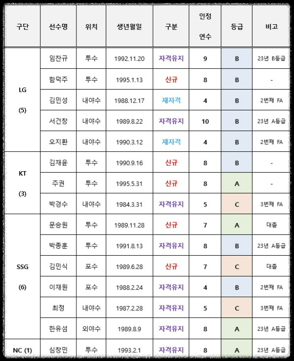 🥎 LG: 임찬규 함덕주 김민성 서건창(이상 B등급)