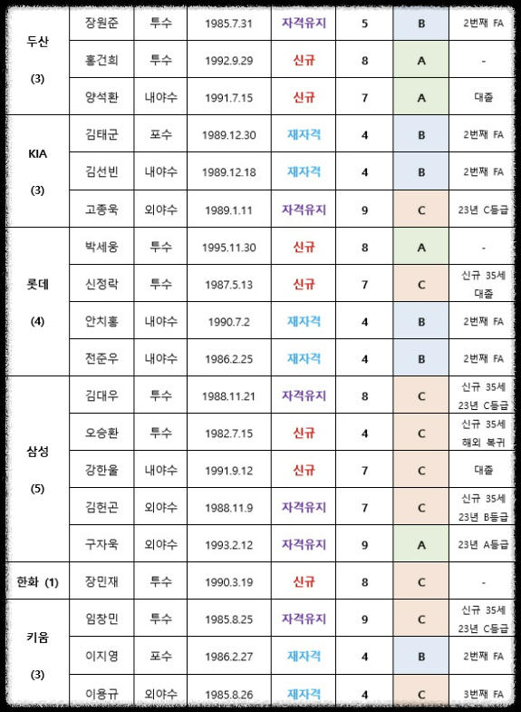 🥎 삼성: 김대우 오승환 강한울 김헌곤(이상 C등급)