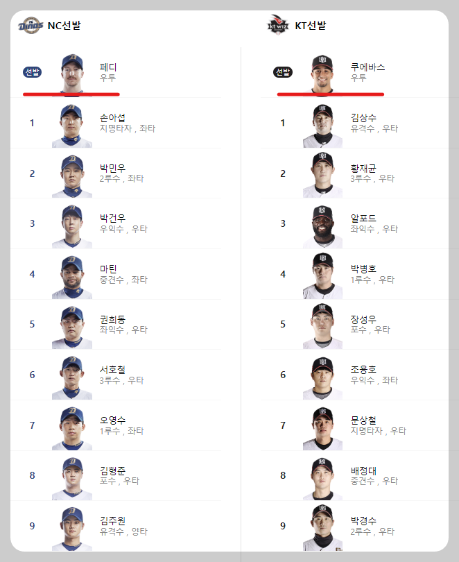 안녕하세요, 드디어 많은 야구팬들이 기다리셨던 NC 대 KT의 플레이오프 경기가 오늘부터 시작됩니다. 두 팀 모두 선발 투수로 막강한 에이스들을 내보냈는데요, 바로 NC의 페디 대 KT의 쿠에바스