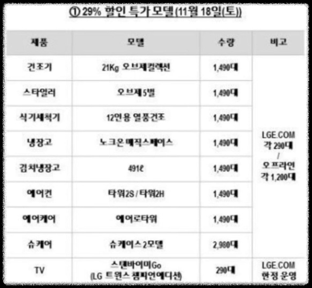 📌건조기 및 스타일러, 식기세척기 등 여러 가전 제품을 한정된 수량에 한해서 판매합니다. 아래 내용은 SNS에서 퍼지던 이벤트 대상 제품 내역과 수량입니다.