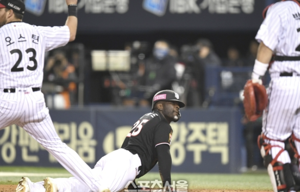 하지만 2회초 다시 무사 1,2루의 기회를 잡은 KT, 동점과 역전의 기회를 잡았지만 문상철의 번트 상황에서 3루&1루 병살플레이, 거기에 2루 주자가 3루를 훔치다 아웃되어 삼중살로 연결되며 분위기에 찬물을 끼얹었습니다. 그 이후 양팀 선발의 호투가 계속된 가운데 4회초 KT가 동점을 만들었습니다. 1사 1,2루 상황에서 장성우의 우중간 1루타가 나왔지만 역시나 실책까지 발생하며 1점을 헌납, 동점을 허용하였습니다. 하지만 켈리는 상황을 잘 마무리하였습니다.
