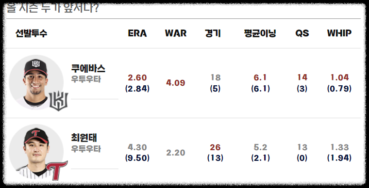 ✅ 양팀 선발 투수 : 쿠에바스 VS 최원태