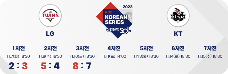 | LG KT 한국시리즈 5차전 중계방송 및 일정 경기 예측, LG 우승?! (0) | 2023.11.12 |