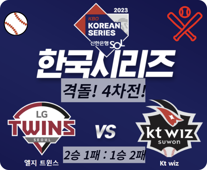 LG가 유리한 고지를 점령한 가운데(시리즈 전적 2 대 1) LG와 KT의 한국시리즈 4차전 경기가 수원에서 열립니다. 이번 경기는 낮 경기로 펼쳐지는데요. 과연 KT가 다시 균형을 맞출런지, 아니면 LG가 우승에 가까워지는지 경기를 통해 놓치지 말고 확인해 보세요. 지금부터 선발 라인업, 남은 경기 일정, 중계보는 방법등에 대해서 알아보도록 하겠습니다.