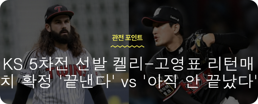📌 LG 켈리 : 1차전에서 6.1이닝 4피안타 2실점(1자책)을 기록했으며 이번에는 LG의 우승을 확정해야 하는 임무를 맡았습니다. 과연 29년만에 우승을 결정하는 마지막 경기에서 잠실 예수 켈리는 에이스의 모습을 보여줄까요?