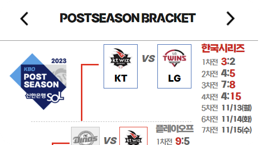 | LG KT 한국시리즈 4차전 중계방송 및 일정 경기 예측 (0) | 2023.11.10 |