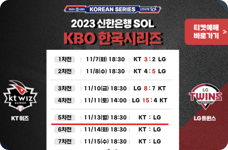 | LG KT 한국시리즈 3차전 경기일정 선발라인업 경기 중계보기 티켓예매 (0) | 2023.11.10 |