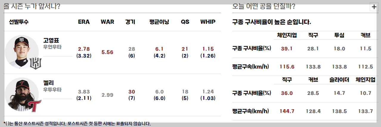 ✅ 선발 투수 : 켈리 vs 고영표