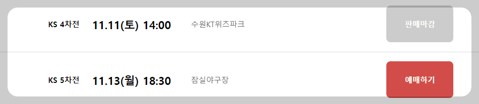 📌 마지막 한국시리즈 경기가 될 수도 있는 5차전을 현장에서 관람하기 위한 분은 티켓 예매 홈페이지를 통해 빠르게 예매하세요. 해당 경기 티켓의 매진 상태를 확인하고 진행하시면 됩니다.