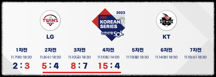 | LG KT 한국시리즈 4차전 중계방송 및 일정 경기 예측 (0) | 2023.11.10 |