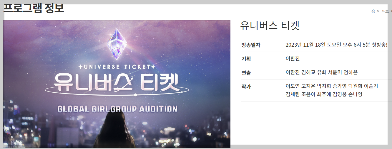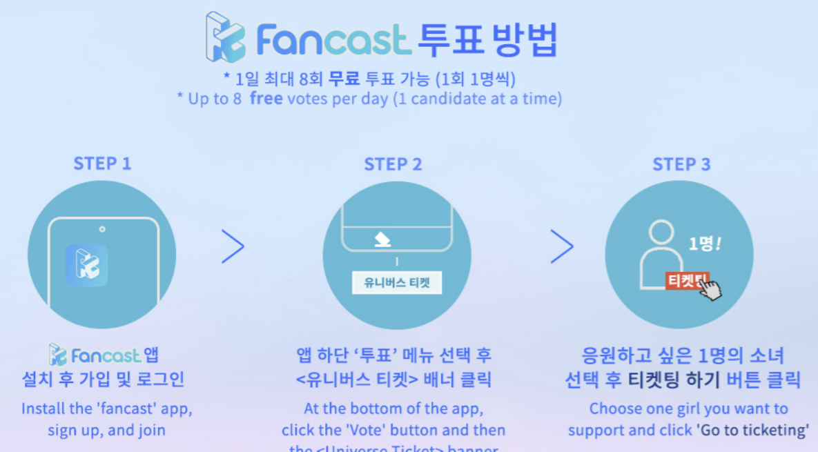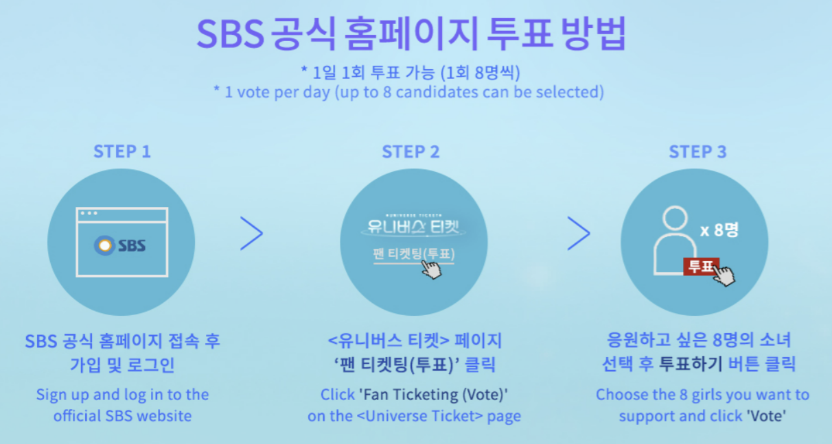 SBS 신규 아이돌 오디션 예능 유니버스 티켓이 드디어 베일을 벗었습니다. 지난 18일 첫 방영된 유니버스 티켓은 아이돌 그룹 데뷔 멤버 선발을 위한 서바이벌 프로그램입니다. 최종적으로 세계 각국에서 몰려온 82명이 출전한 유니버스 티켓은 향후 2년 6개월 동안 활동하게 될 프로젝트 걸그룹을 선정하게 됩니다. 그럼 지금부터 유니버스티켓 방영 정보와 투표하는 방법을 알아보겠습니다.